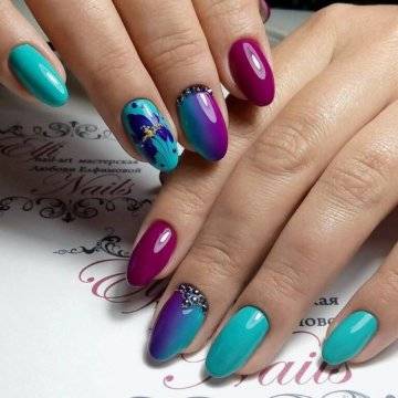 Для тех, кто любит яркий градиент, можно дополнить маникюр наклейками, рисунками, стразами, блестками.
