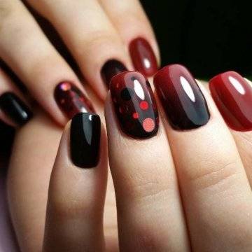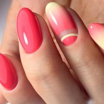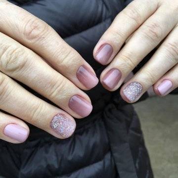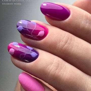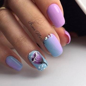 - Оригинальный маникюр. Данный вариант представляет собой переход оттенков от одного пальчика к другому. Этот nail-дизайн будет выигрышно смотреться даже на коротких ноготках.