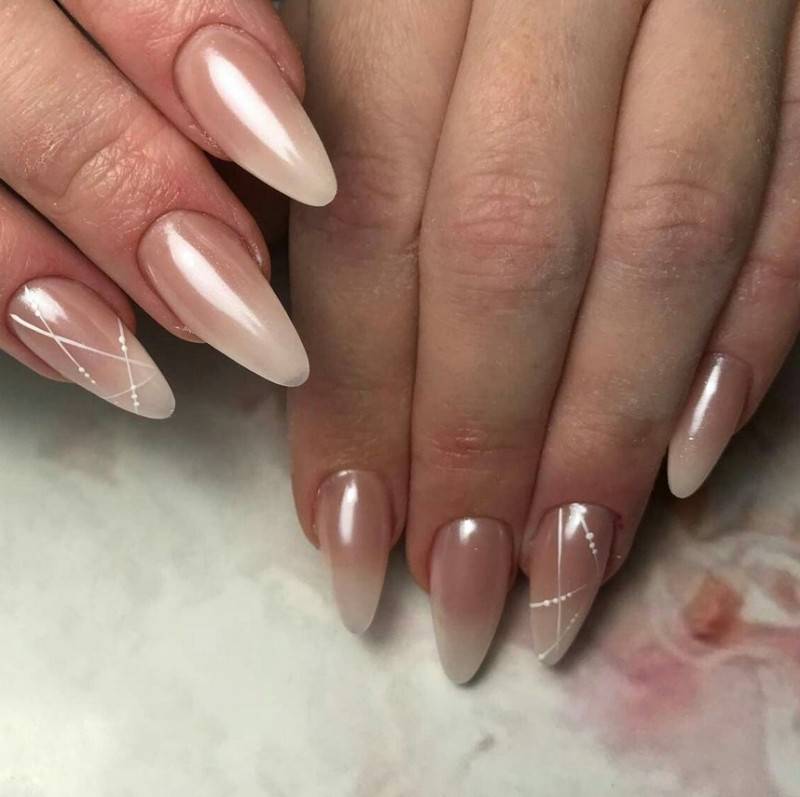 Удачный вариант и упомянутый ранее молочный градиент. На длинных ногтях он смотрится не менее стильно и привлекательно, чем на коротких и отлично сочетает индивидуальность и спокойствие.