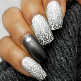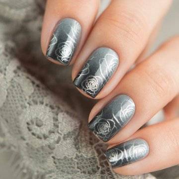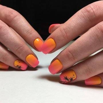 Гель лак и шеллак в качестве базы для градиентного маникюра позволят выровнять ногтевую пластину и нанести на нее не только цвет, но и сложный рисунок. Так, ноготь на безымянном пальце можно оформить рисунком двух черных пальм на белом фоне, а остальные ногти оформить с использованием градиента, создав переход от белого цвета к черному. Такой маникюр получится достаточно лаконичным, поэтому можно усложнить дизайн и добавить несколько стразов на ноготь среднего пальца, расположив их возле основания.