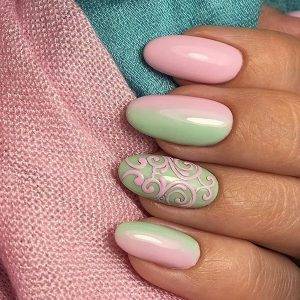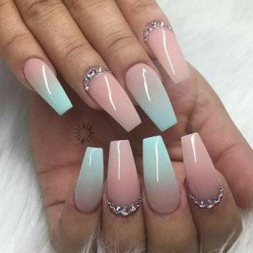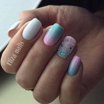Лучше применять нежные тона для пастельного, молочного омбре, но дополнять их стразами, рисунками, блёстками.