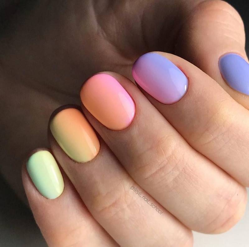 В такой технике красиво смотрятся цвета радуги, плавно перетекающие с одно пальчика ногтевой пластины в другой.