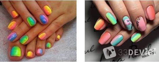 Красочный маникюр «Радуга» прекрасно смотрится летом. Можно использовать несколько цветов или всю палитру. Есть несколько техник для радужного маникюра:
