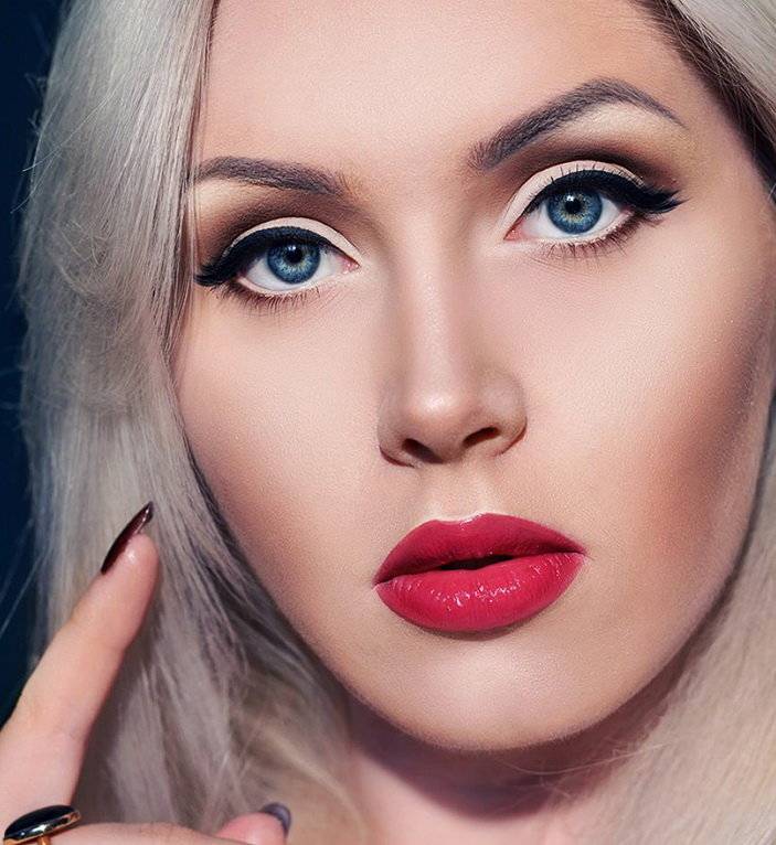 Синие оттенки также можно использовать, они визуально смягчают взгляд. Однако лучше отдавать предпочтение определённому тону теней только после тщательного подбора румян и помады, чтобы избежать перегруженности мейкапа.
