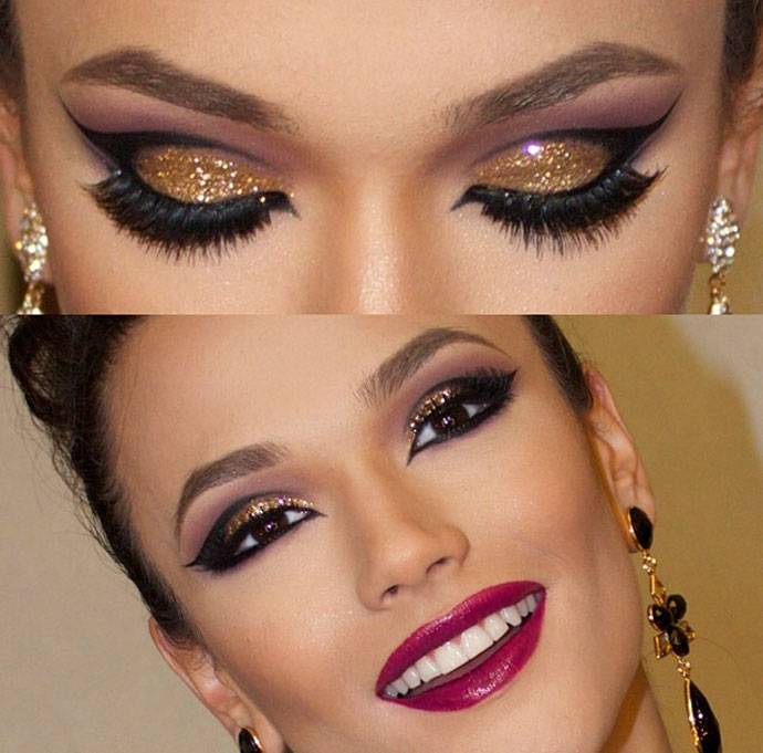 При этом тени могут быть матовыми или перламутровыми, в зависимости от повода. Мейкап можно дополнять стрелками чёрного, коричневого, серебристого и золотистого оттенка. Для дневного макияжа лучше избегать использования яркой подводки.