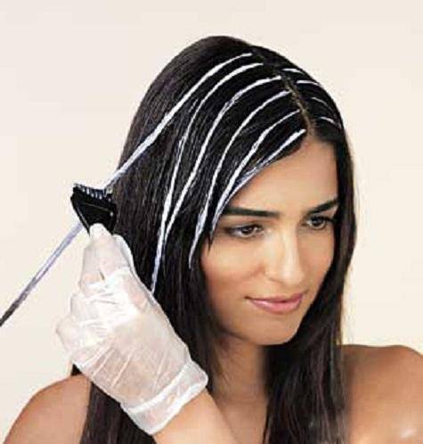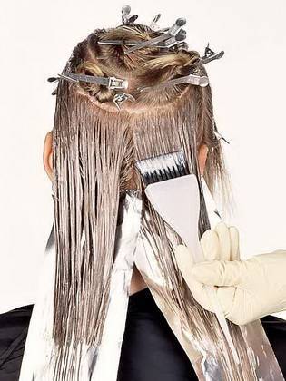 - На заранее осветленные пряди наносят краску. Прикорневую зону не прокрашивают, сохраняя отступ от 2 до 7 см (в зависимости от длины волос).