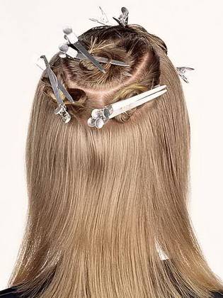 Разделите волосы на горизонтальные и вертикальные проборы. Зафиксируйте нерабочие пряди зажимами.