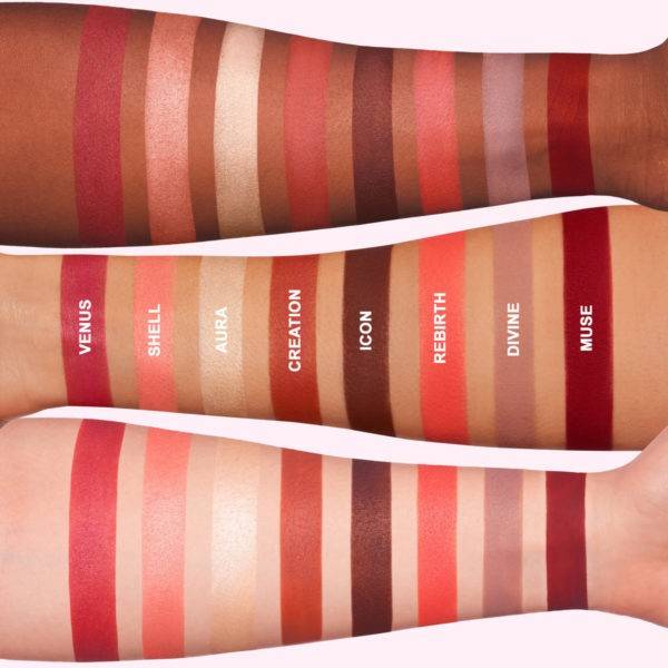 The goddess-worthy palette Venus fans have been longing for. 18 long-wearing shades, 4 unique finishes, 1 swipe coverage designed for eyes, cheek, and face. An epic new take on the palette that started it all with shades ranging from rustic reds, golden roses, berries and pinks to bronzed neutrals. Highly pigmented, ultra-buttery formula lays down a supreme color payoff that doesn’t fade or fall out. The instant cult classic arrives in a beautifully mirrored gilded pink box, idolizing Venus herself.