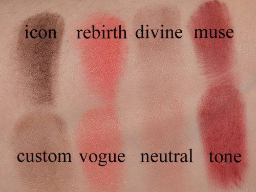 Общий свотч всех оттенков. Свотчи сделаны пальцем на голую кожу.