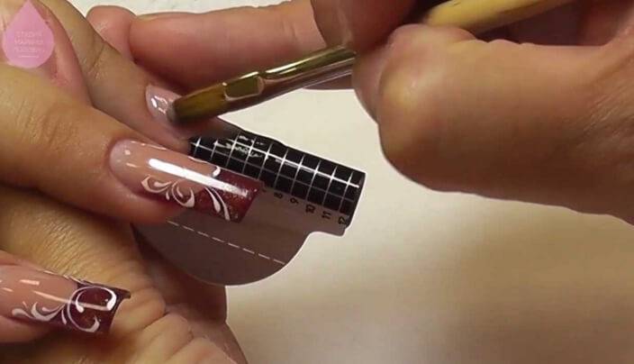 - После выполнения всех перечисленных задач берется специальная кисточка, с помощью которой производится выкладывание на шаблоны акрила либо геля. Кстати, на них указаны деления. Они помогают придать ногтям одной длины.