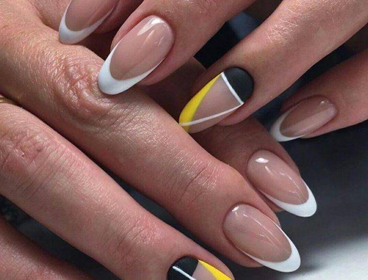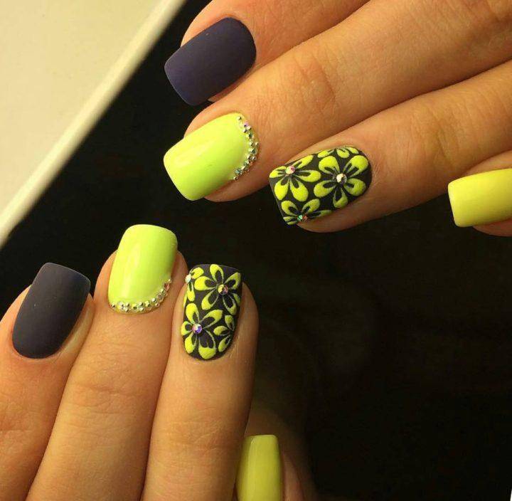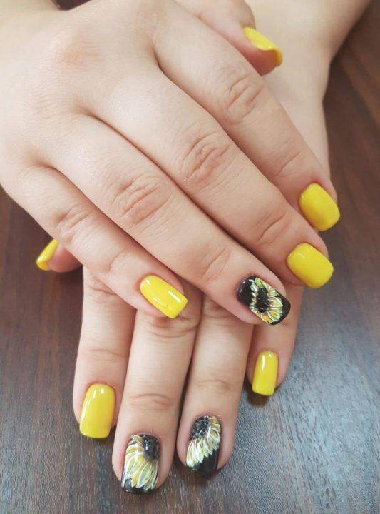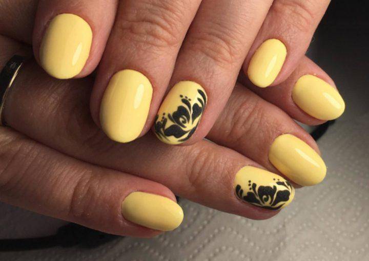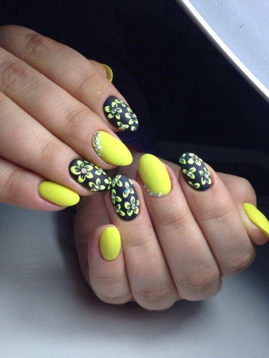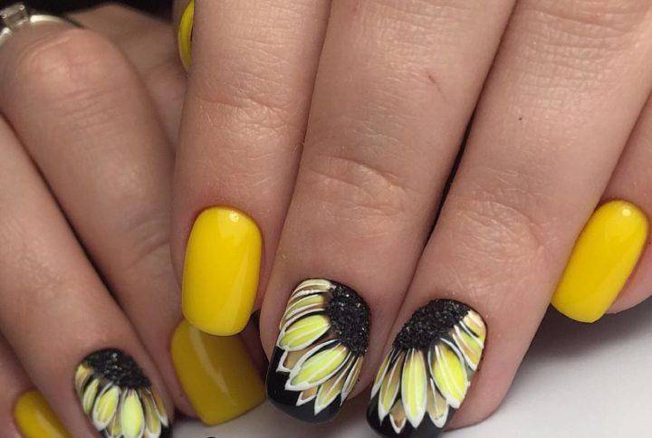 Желто-черный маникюр отличный выбор на весенний период, где цвета напоминает нам черно-желтое тело пчелы. Такой маникюр очень яркий и оригинальный, но новинка заключается в том, что мастера стали не просто совмещать два ярких цвета вместе, а рисовать на таком покрытии геометрические рисунки, а также минималистические цветы.