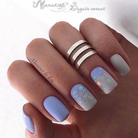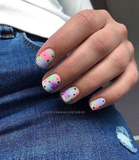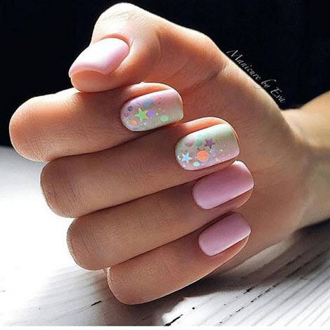 Кроме того, очень стильно и нарядно смотрится омбре в сочетании с дизайном «Перепелиное яйцо». Также, к ним можно добавить небольшой рисунок и матовый топ. Посмотрите, какая красота может получиться.