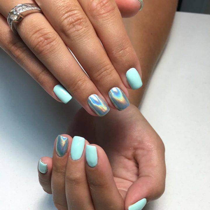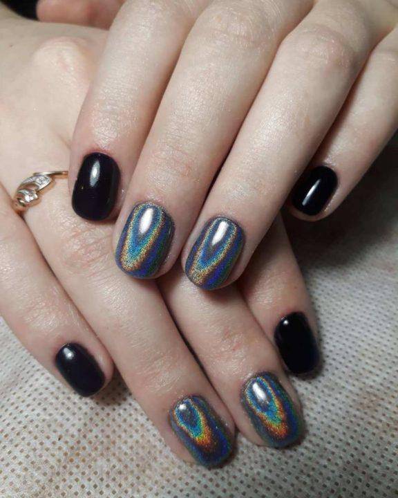 А вот для более ярких и фантастических переливов цветов можно использовать голографическую втирку, которая под разным углом обзора будет менять свой цвет. Но такой вариант маникюра лучше сделать в салоне, чтобы результат получится максимально удачным.