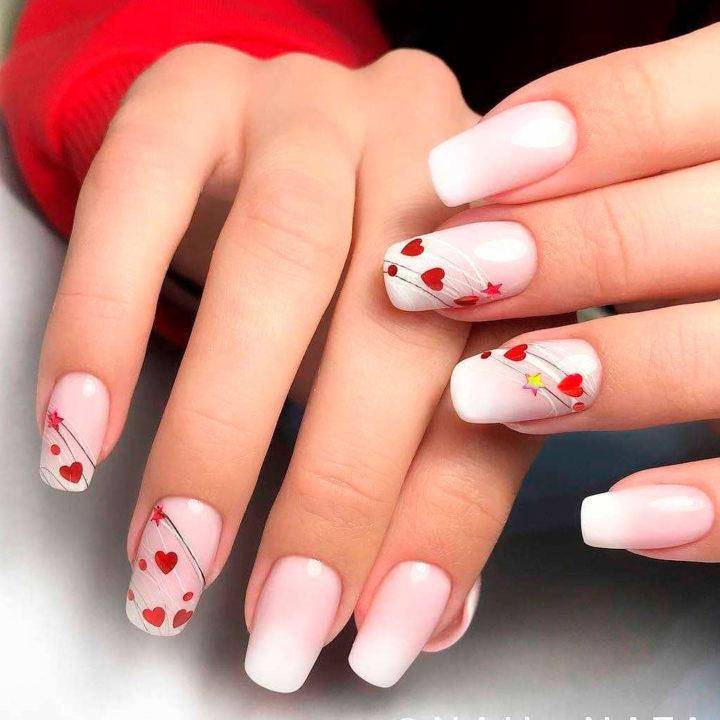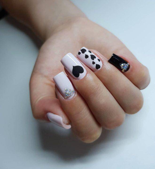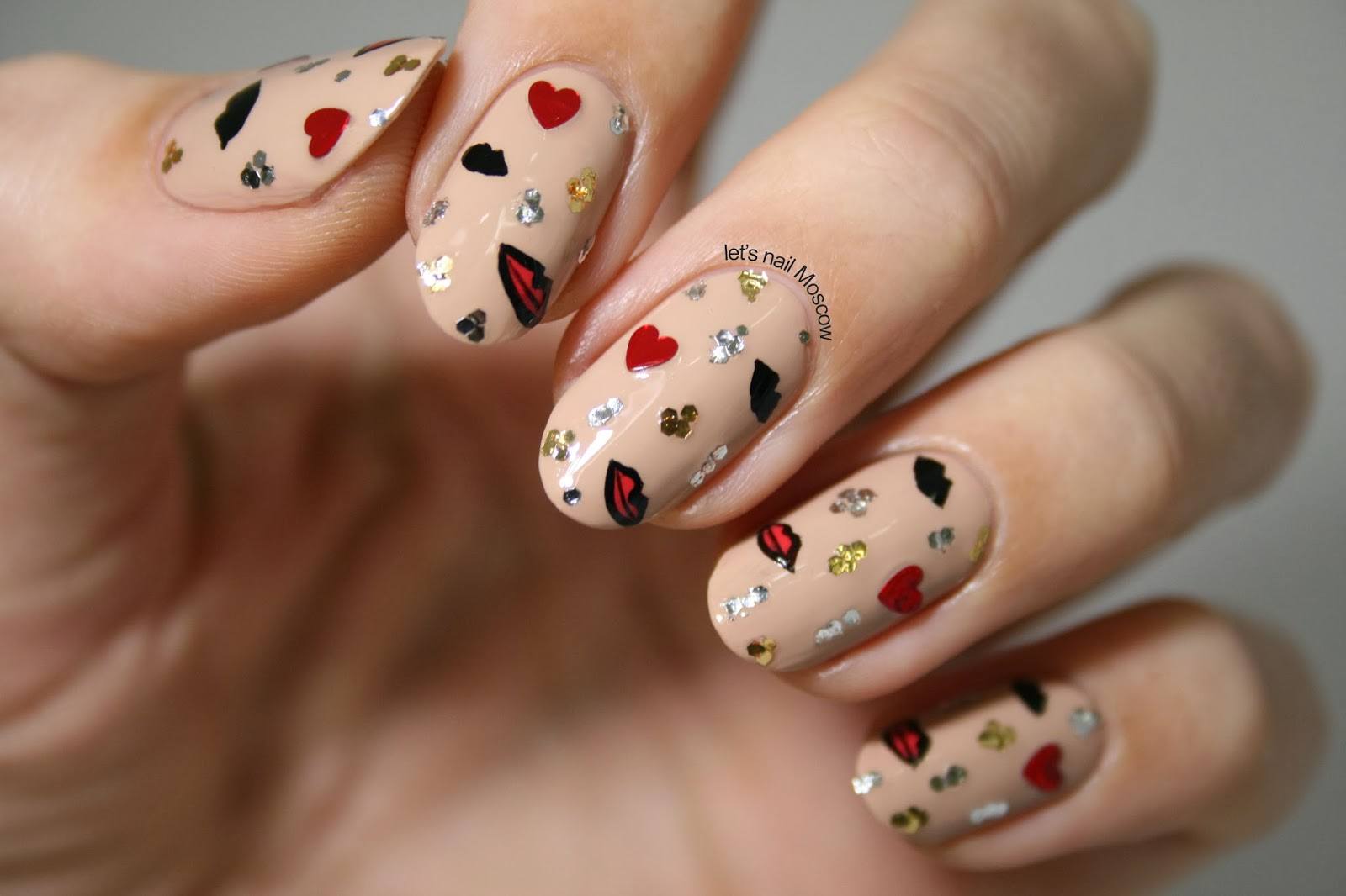 А можно выложить сердечко из страз или использовать мелкие рисунки и другой принт. Еще одним интересным методом нанесения сердечек является трафаретный.