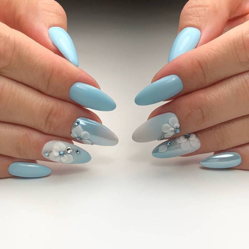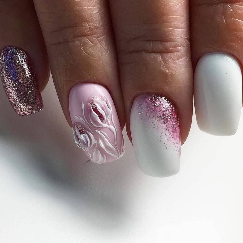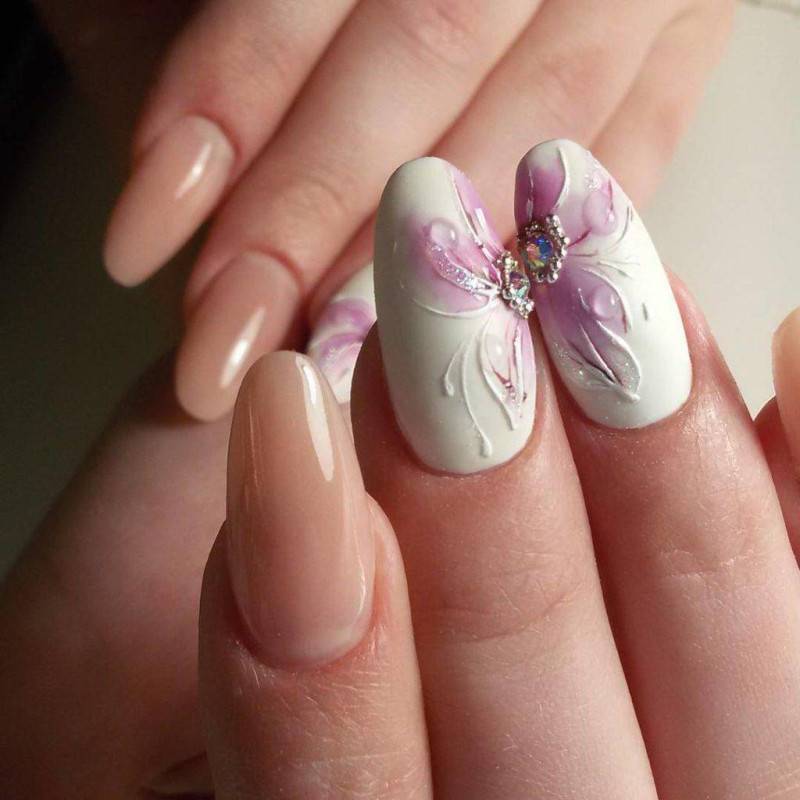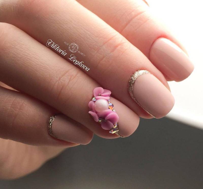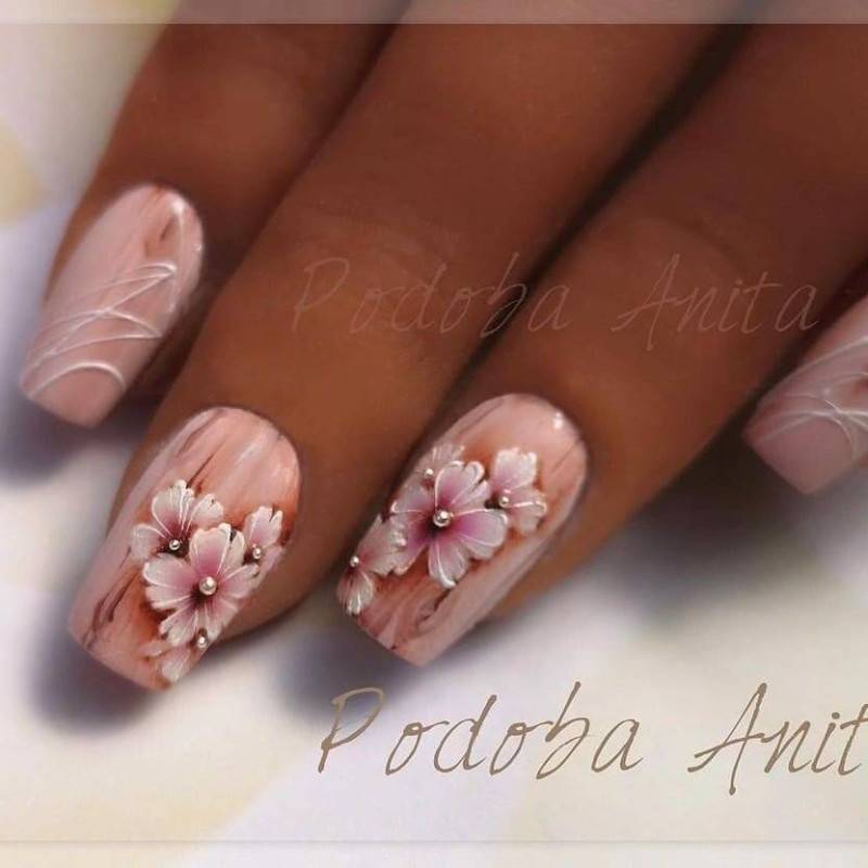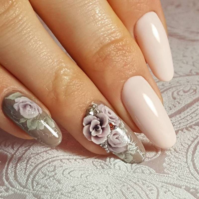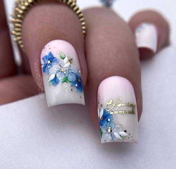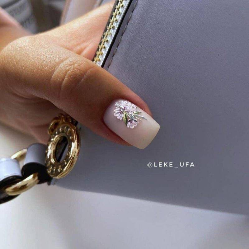 Еще одной весьма актуальной идеей будет сделать на весну маникюр с цветочной лепкой. Лепка делает цветы выпуклыми, что придает им большей реалистичности. Богатая палитра позволяет создавать яркие и пестрые цветы или более нежные и спокойные. Не редко вместе с лепкой мастера используют различный декор.