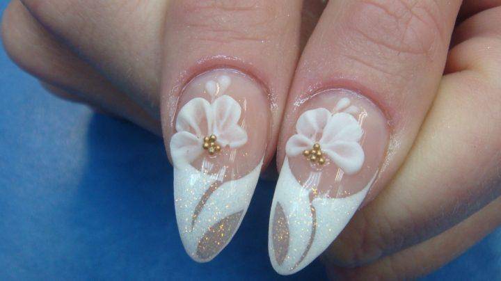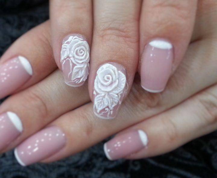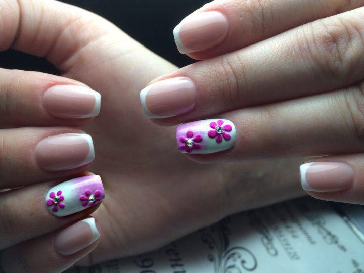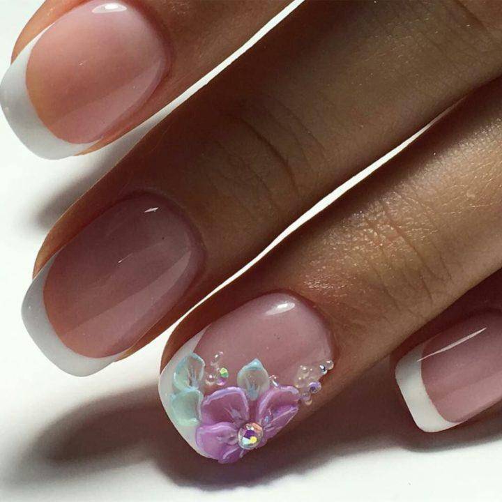 Они могут украшать блестками лепестки цветочка, а в серединку вклеивают страз. Лепка цветов выполняется на любое покрытие в том числе и французский вид маникюра. Такие цветы будут одинаково хорошо смотреться на глянцевом и матовом покрытии.
