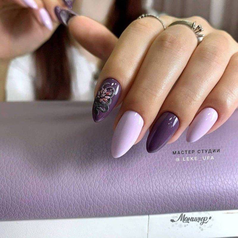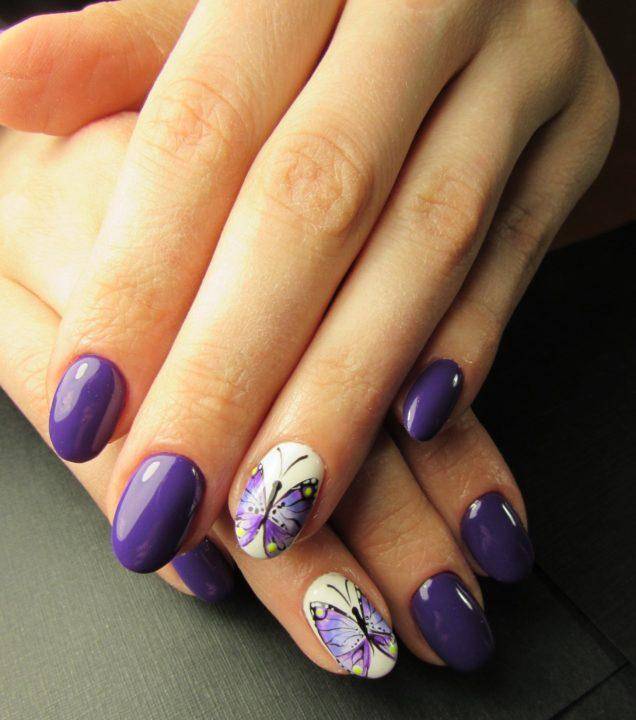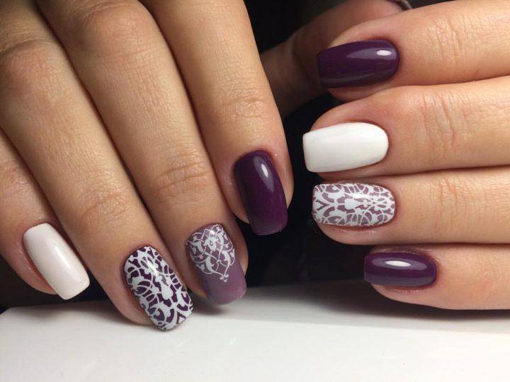 Фиолетовый цвет часто комбинируют с белым, синим и черным лаком, что вместе создает потрясающий контраст цветов, где каждый цвет выгодно подчеркивает другой.