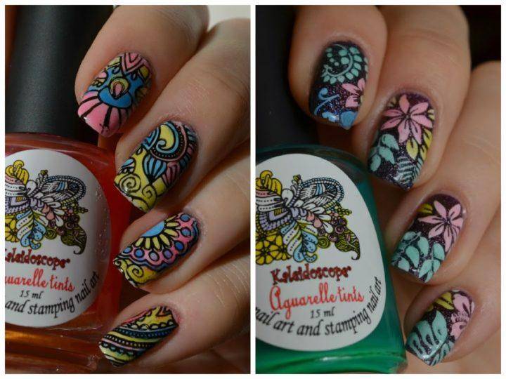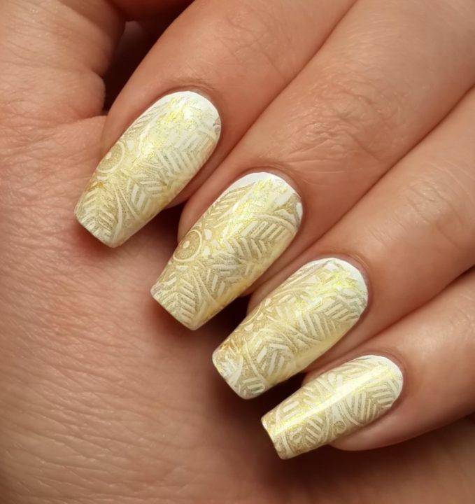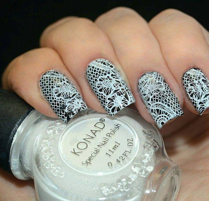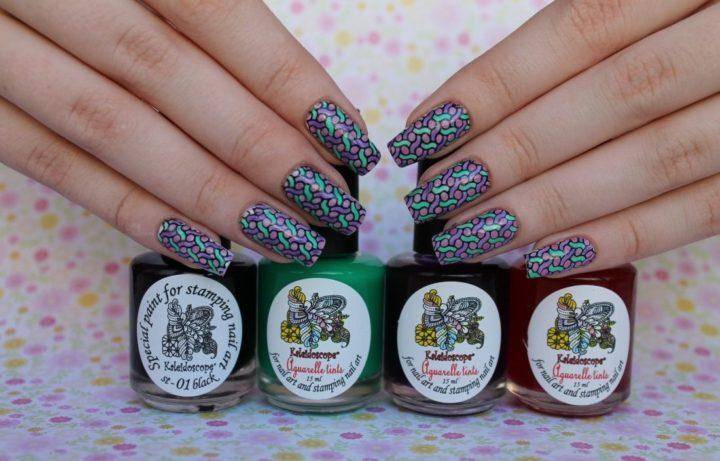 Вручную невозможно добиться такой филигранной работы, как получается в технике стемпинг. Здесь раздолье для творения разнообразных узоров: полоски, узоры, сеточки, зигзаги, ажур и другое. Цвет может быть любой: от светлых и темных оттенков, до разноцветных и блестящих.
