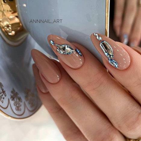 Иногда этот вид маникюра еще называют жидкий металл, капля металла, плавленое золото, ртуть.