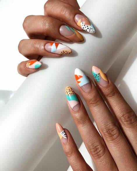 Самый модный маникюр весна-лето 2024 нашел место и геометрическим рисункам. Сложные узоры, напоминающие орнамент или технику колор-блок, остаются самыми трендовыми и популярными в весенне-летнем дизайне.