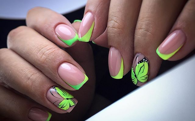 В этом сезоне очень модным является дизайн с рисунками бабочек. Они символизируют пробуждение, легкость и воздушность. Очень нежно и красиво смотрится этот дизайн в сочетании с нежным сиреневым, голубым, желтым, молочным или розовым основным фоном.