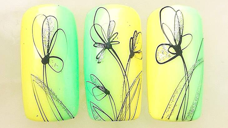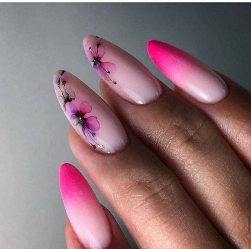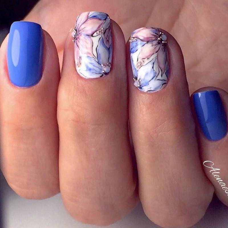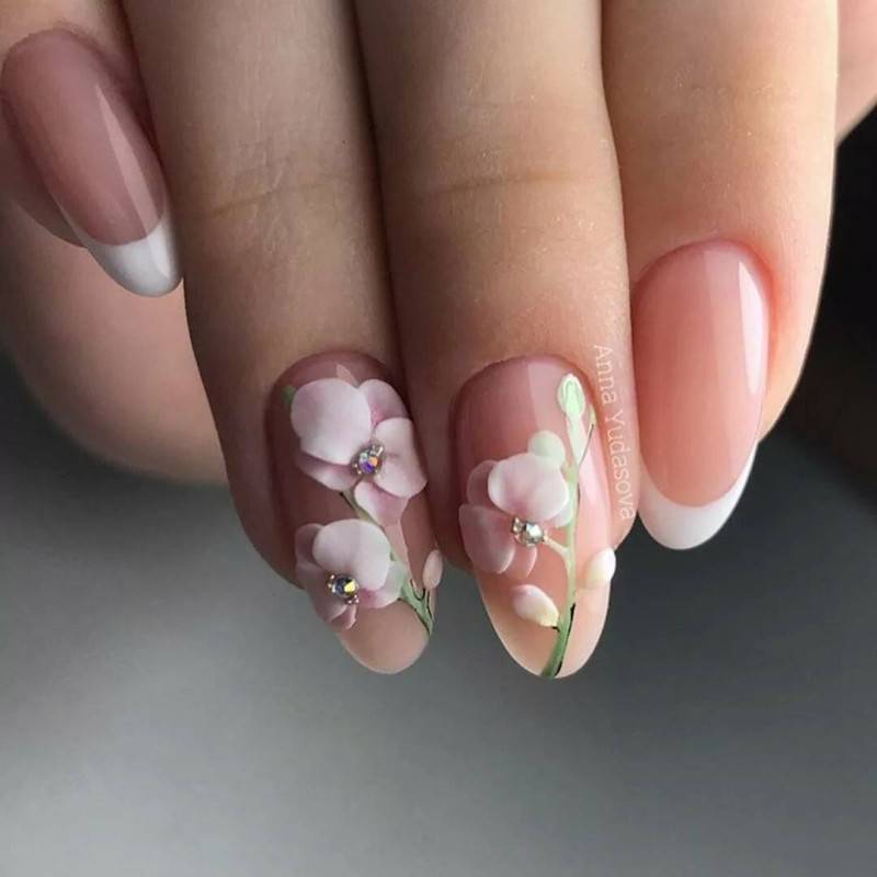 Несомненно, флористика будет гармонировать с градиентным нейл-дизайном, стразами, плавными элементами узоров.