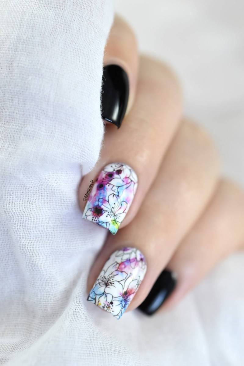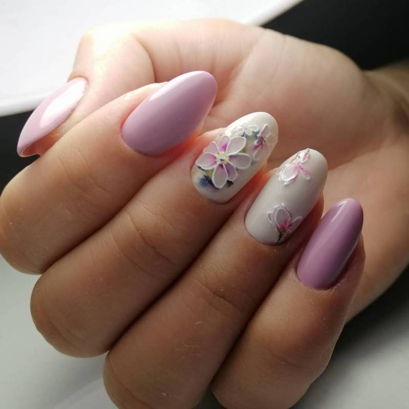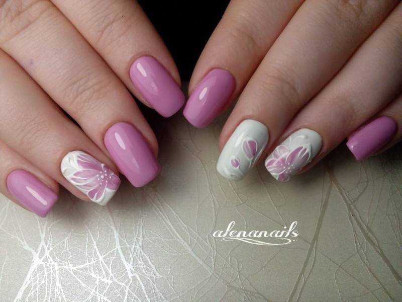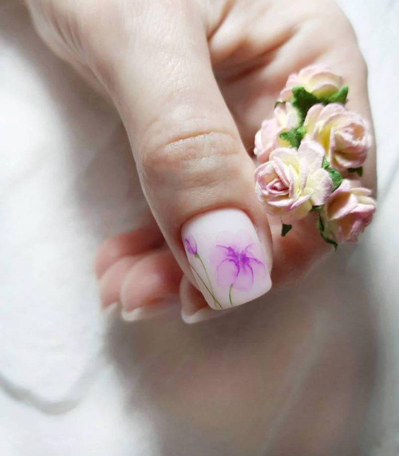 Работать с акварелью умеют не все мастера, поэтому если вы решили выполнить такой дизайн, заранее поинтересуйтесь у мастера о его опыте. Акварельный маникюр выполняется в светлых тонах, главным из которых является белый. На белом фоне цветы смотрятся очень мягко и сдержанно. Для изображения цветов используется фиолетовый и розовый цвета с многочисленными полутонами.