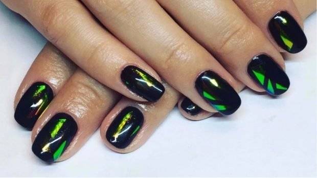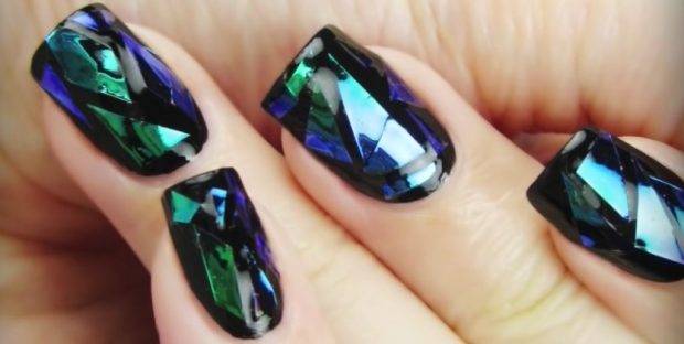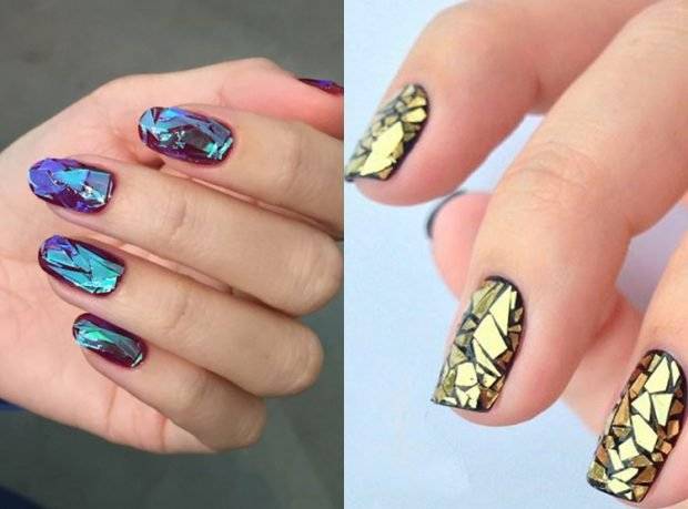 В большинстве случаев сравнительно недавнее творение нейл-дизайнеров выбирается девушками для дискотек и вечеринок. «Битое стекло» отличается неординарным видом из-за эффекта склейки блестящих кусочков. Для создания такой картинки в ход идут фольга, слюда или голографическая пленка, кусочки которых имитируют осколки битого стекла.