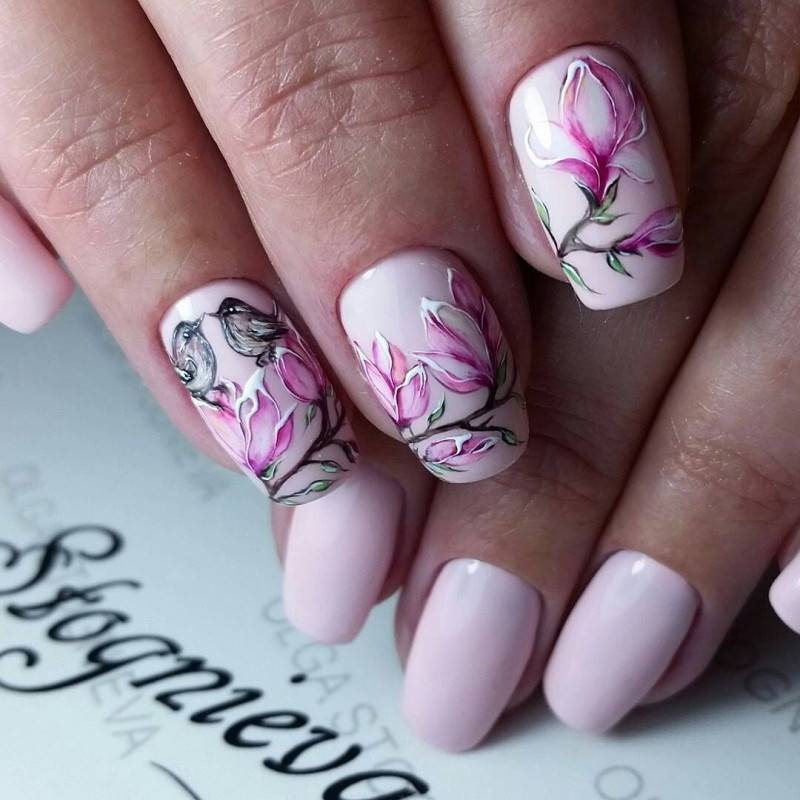 Первое место в нашем весеннем nail-параде традиционно занимает всеми любимый дизайн с различными рисунками: цветов, веточек и листиков, бабочек и птичек, и других различных рисунков в весенней тематике.