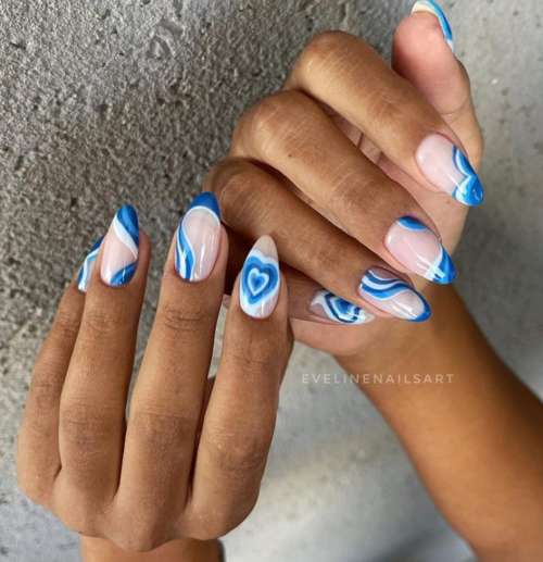Весна ассоциируется с голубым небом, поэтому этот цвет оптимальный вариант для стиля френч. Здесь отлично впишутся в дизайн рисунки по теме природа, сердечки, облака.