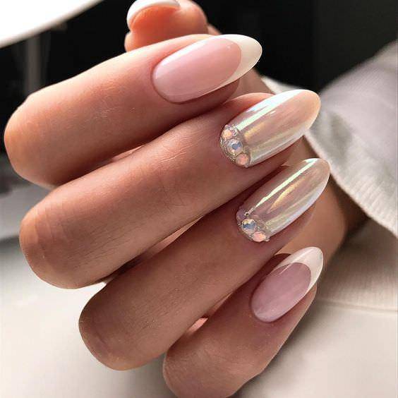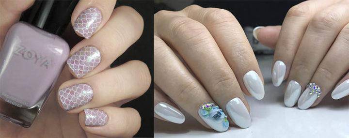 Приоритетом модного маникюра в этом сезоне является нежная естественность, жемчужная втирка на ногтях великолепно этому соответствует. Мягкость свечения с нюдовыми оттенками используется в дизайне маникюра весна 2019 года. Самыми модными оттенками весны являются: жемчужно-розовый, бледно-голубой, жемчужно-белый,бледно-розовый, светло-бежевый и светло-коралловый.