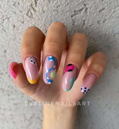 Очень важный момент: не бойтесь соединять разные форматы декора, рисунков, оттенков и техник в модном маникюре весна-лето 2024. Таким образом, Вы сможете получить не просто красивый, а и безумно интересный, привлекательный, запоминающийся и уникальный нейл-арт дизайн.