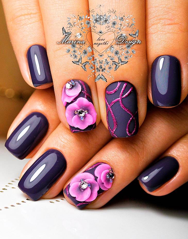 Темный маникюр создает неповторимое сочетание, идеально подходит для вечернего образа. Уместно в качестве основы выбирать более темный, а к нему подобрать лепестки на тон или полтона светлее.