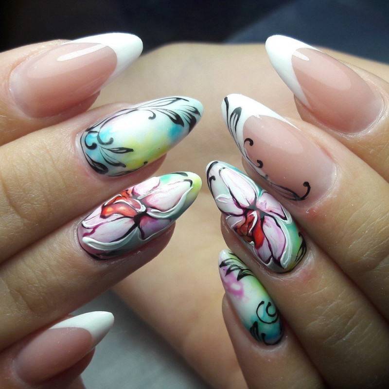 Маникюр акварельными красками смотрится невероятно нежно и воздушно. Благодаря использованию специальной акварели рисунок получается легким и полупрозрачным с эффектом градиента. На фото ниже вы можете видеть пример такого стильного и нежного нейл-арта.