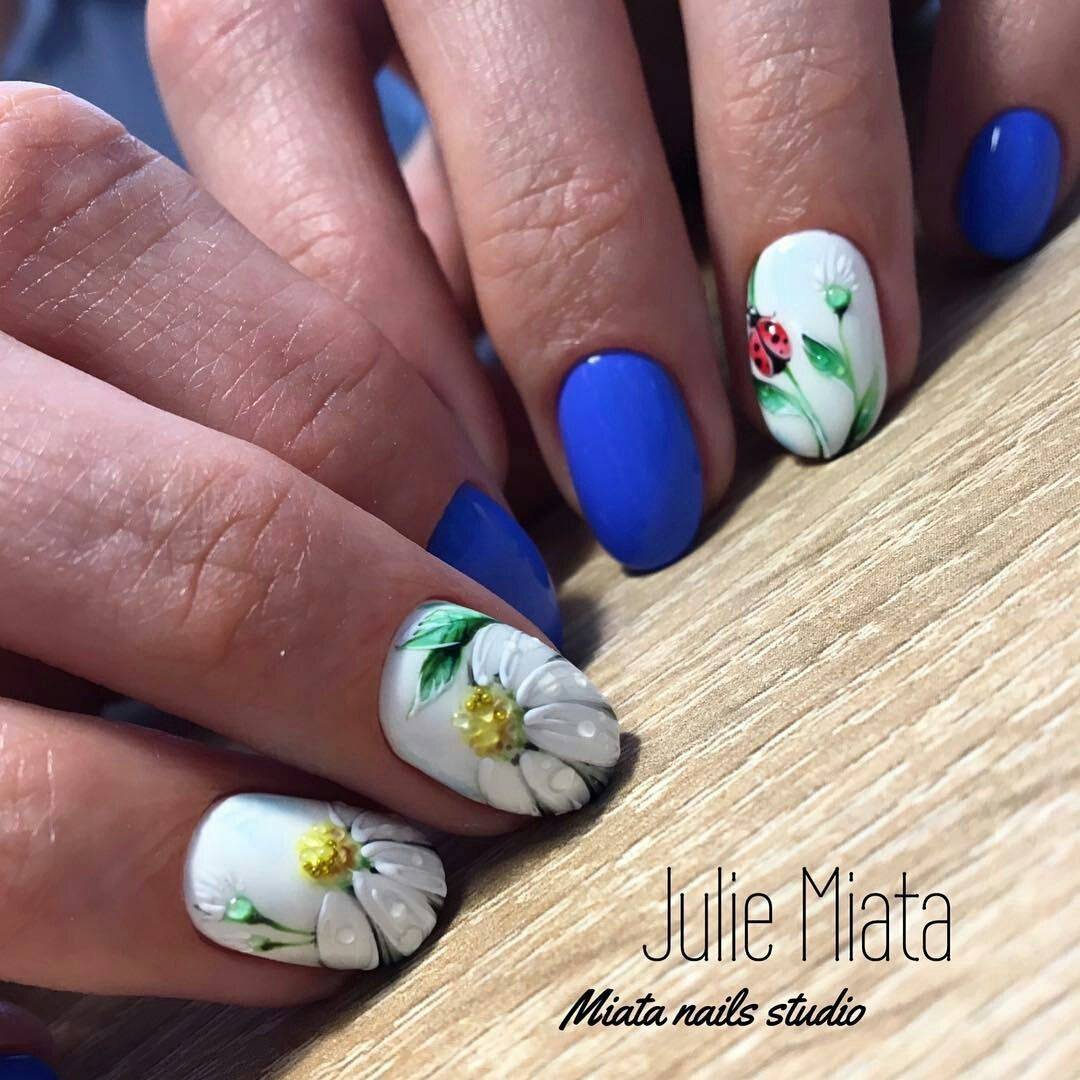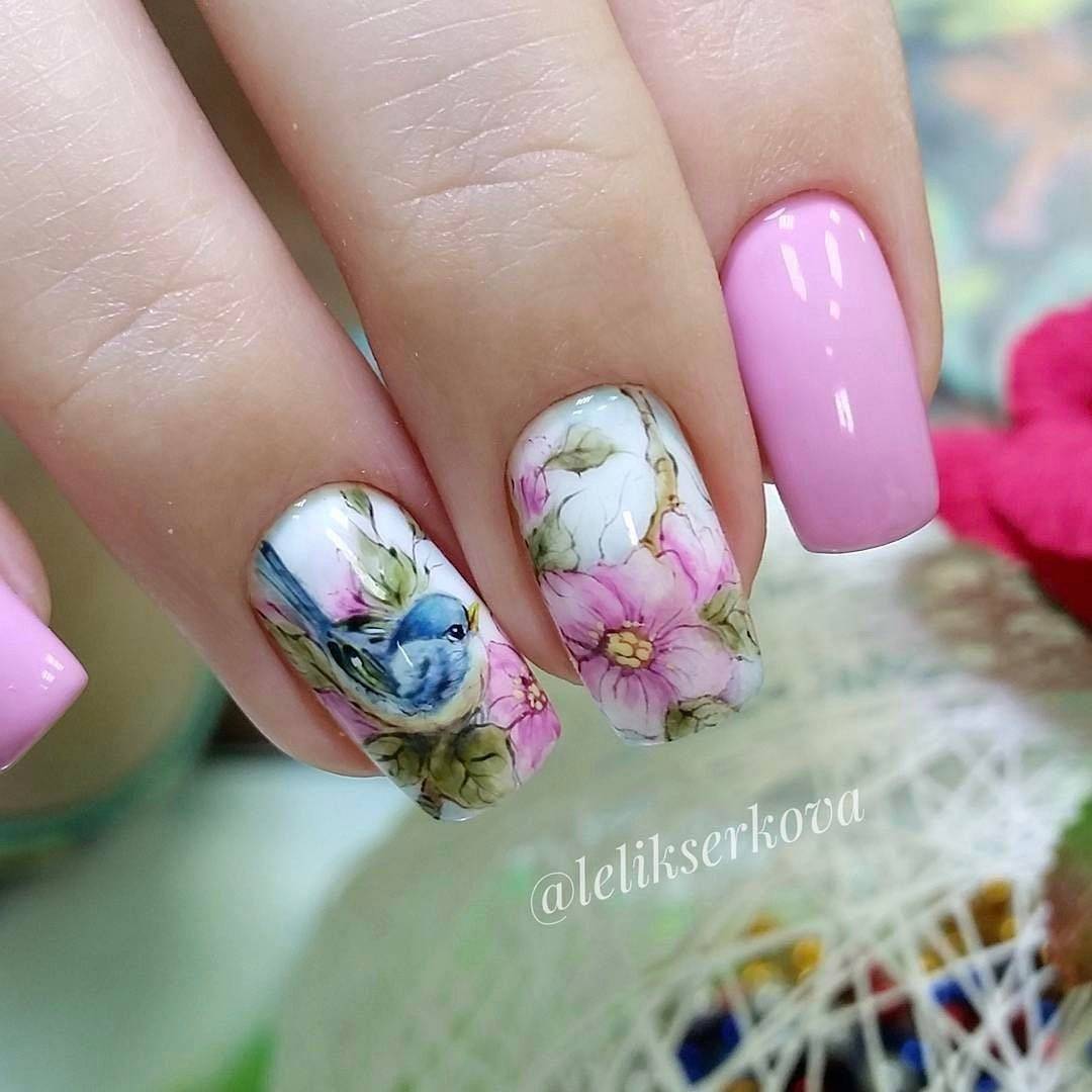 Первое место в нашем весеннем nail-параде традиционно занимает всеми любимый дизайн с различными рисунками: цветов, веточек и листиков, бабочек и птичек, и других различных рисунков в весенней тематике.