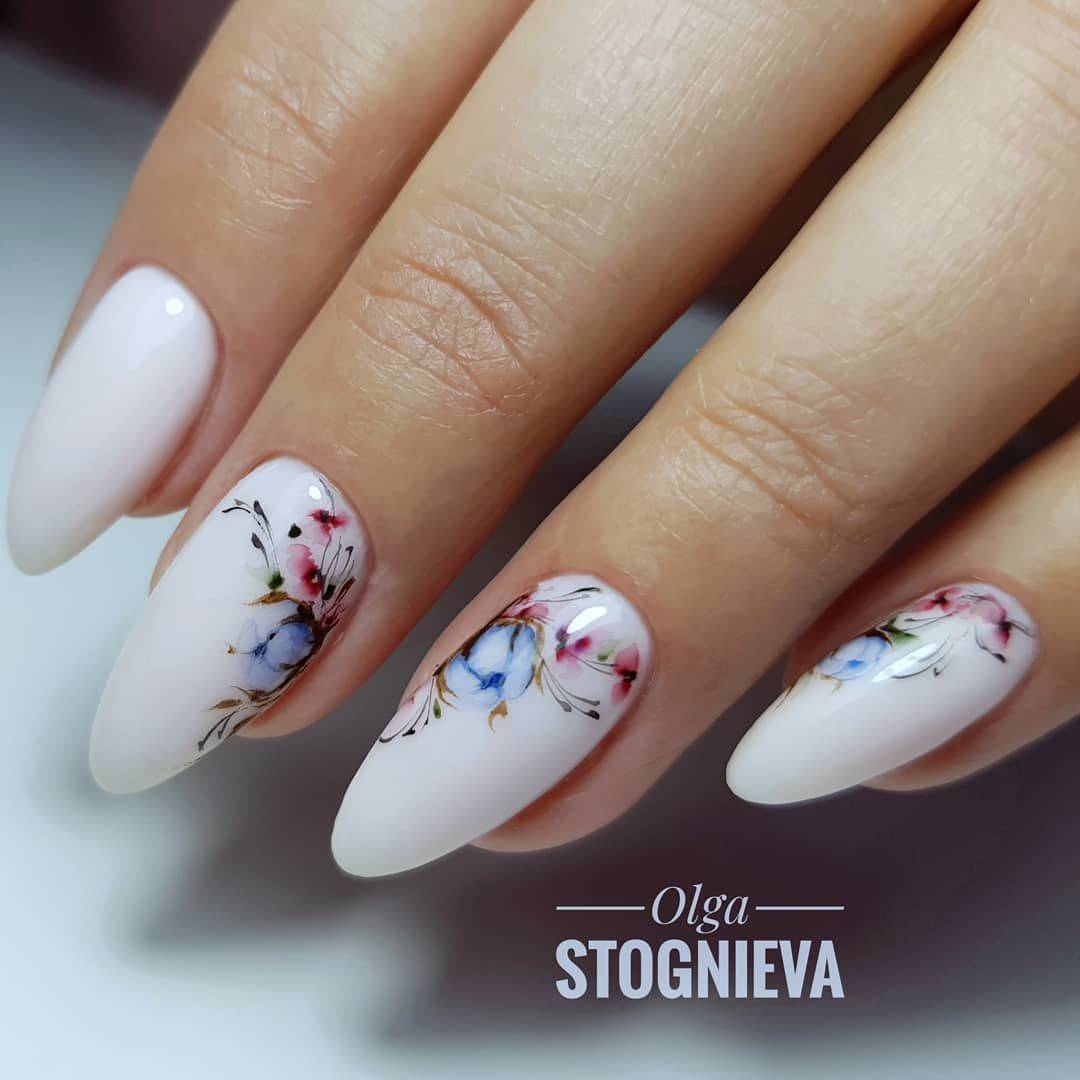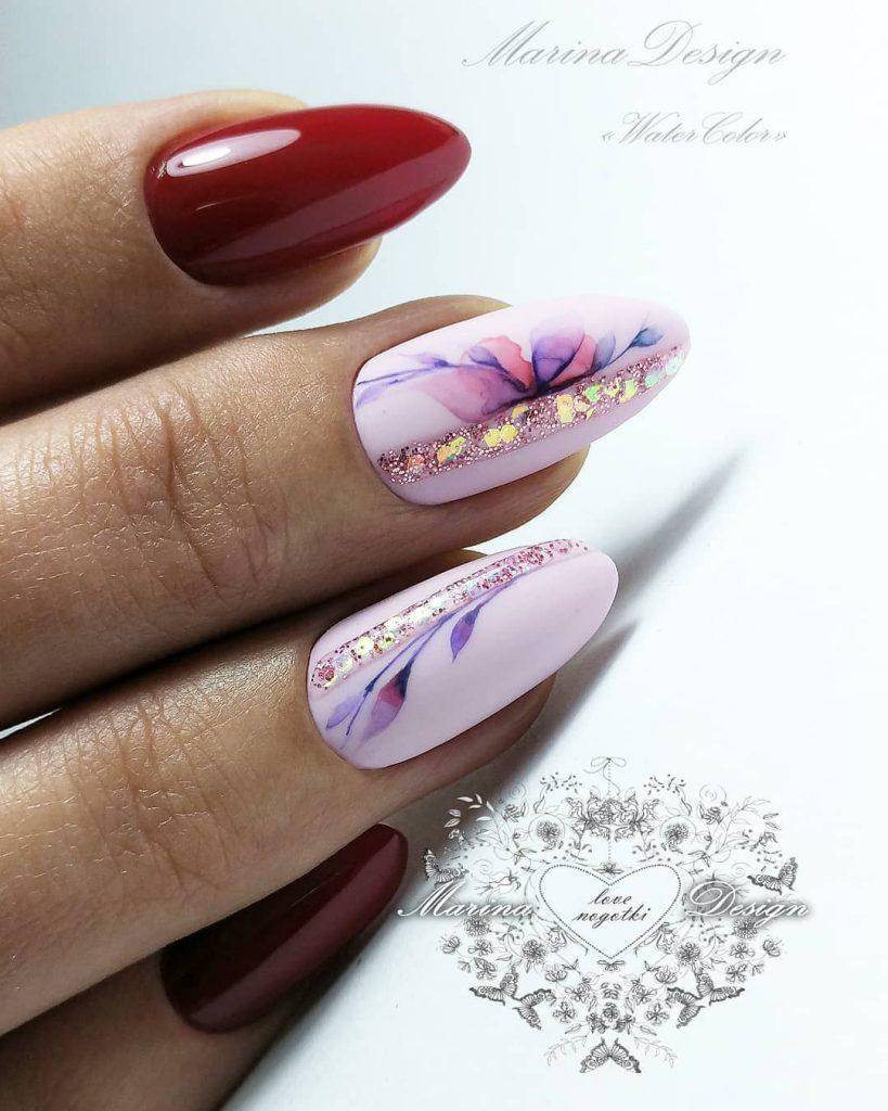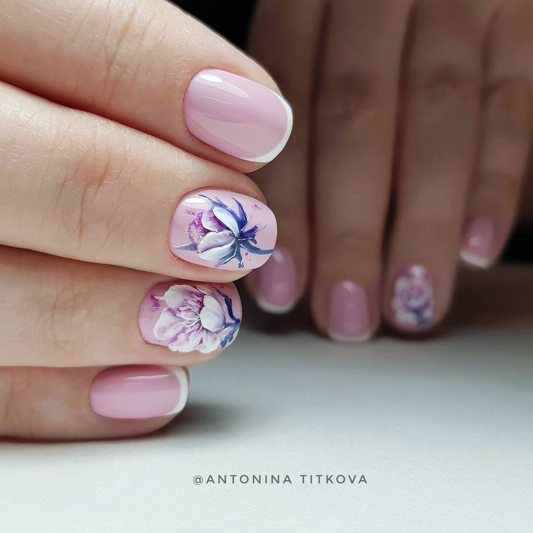Работать с акварелью умеют не все мастера, поэтому если вы решили выполнить такой дизайн, заранее поинтересуйтесь у мастера о его опыте. Акварельный маникюр выполняется в светлых тонах, главным из которых является белый. На белом фоне цветы смотрятся очень мягко и сдержанно. Для изображения цветов используется фиолетовый и розовый цвета с многочисленными полутонами.