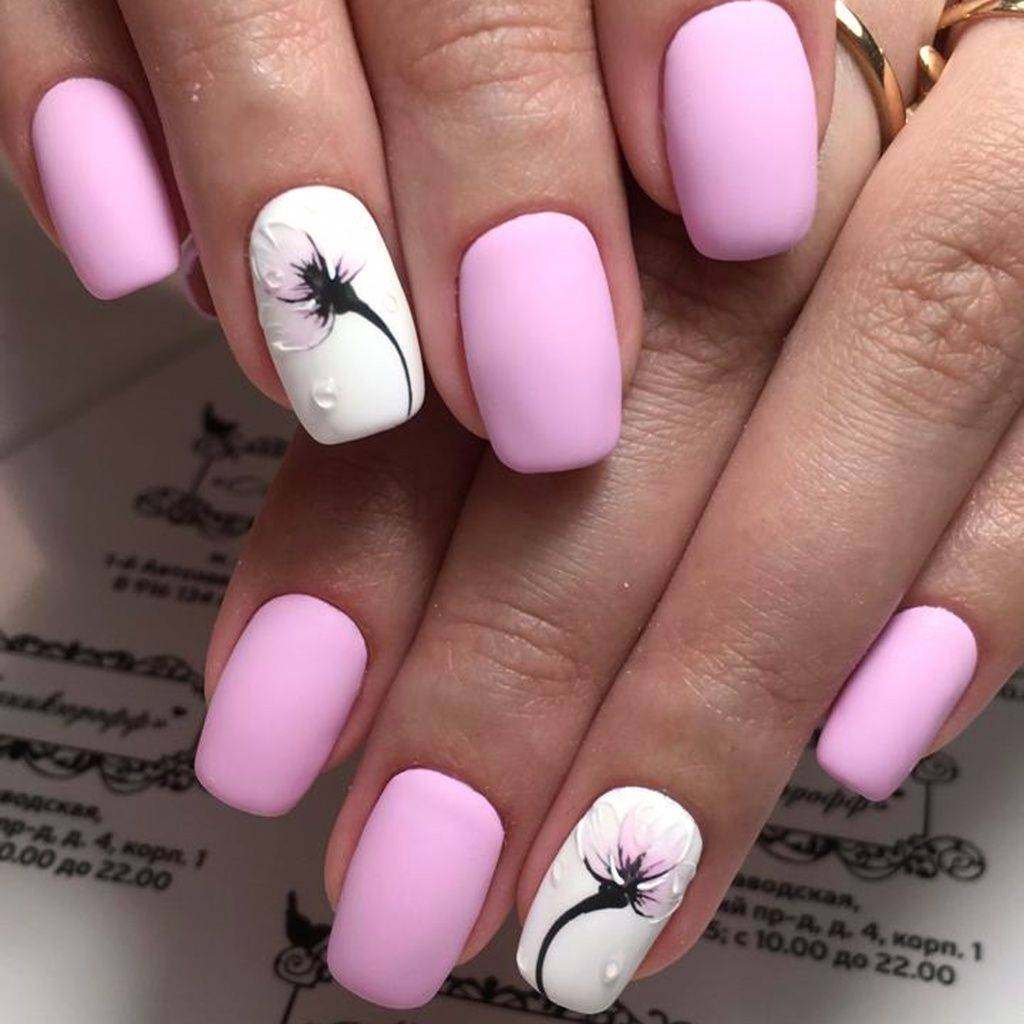 Что касается рисунков цветов, то это могут быть и миниатюрные цветочки расположенные на нескольких или на всех ноготках. Также, это может быть один крупный цветок, расположенный на одном или нескольких ноготках. Очень красиво и по-весеннему нежно смотрятся рисунки: тюльпанов, ромашек, подснежников, маков, сирени, ирисов и различных других цветов символизирующих весну. Кроме того, очень модно и стильно будет смотреться такой дизайн в сочетании с матовым топом.
