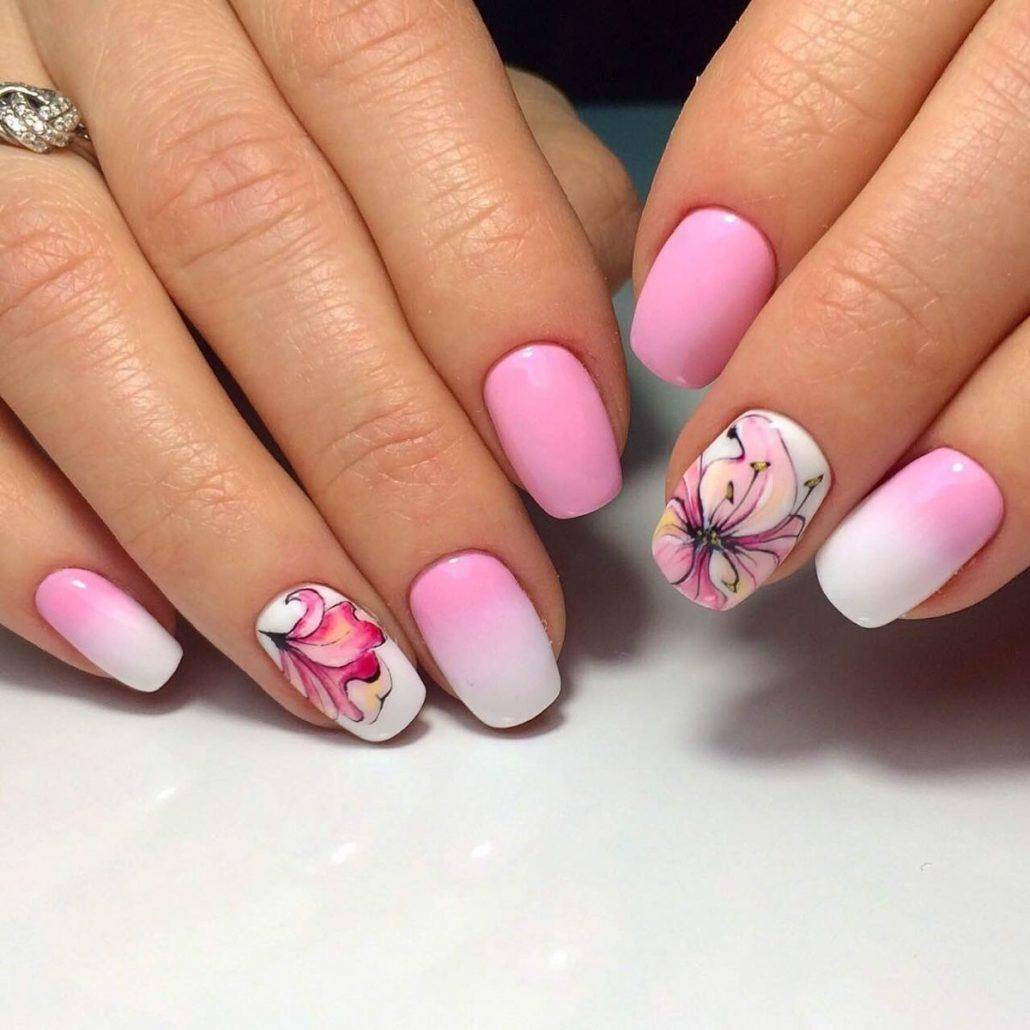 Несомненно, флористика будет гармонировать с градиентным нейл-дизайном, стразами, плавными элементами узоров.