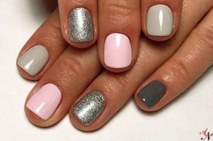 Розовый уместный в праздники и будни, вписывается в любимый имидж в одежде. Чёрный, белый и голубой тон создают красивый контраст. Серый оттенок приглушает розовый, делая ногти спокойными. Эффекты брызг, страз и мрамора выгодно подчеркнут образ.