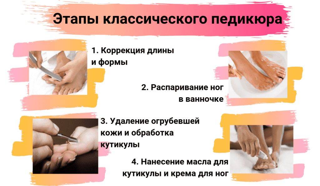 Классический педикюр включает в себя все описанные выше этапы. Разберем их чуть подробнее: