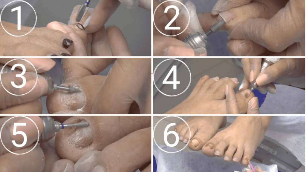Лечебную процедуру проводят не просто мастера педикюра, а люди с медицинским образованием. Они называются врачи-подологи. Схема действий такая же, как и при выполнении европейского педикюра.