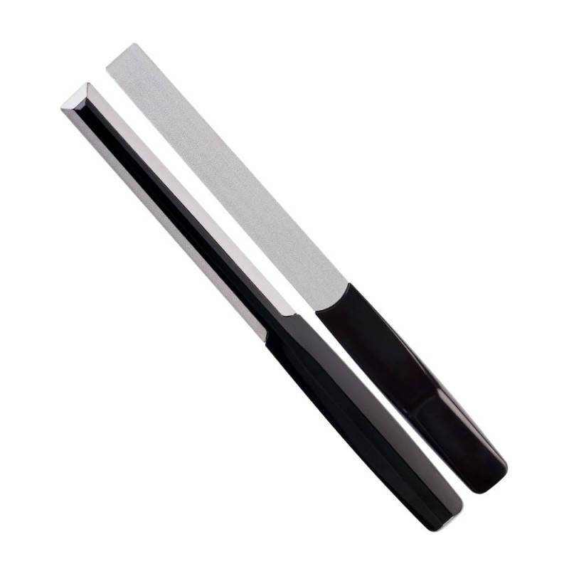 Верхнее напыление – сапфировое. С одной стороны абразивное покрытие крупнозернистое, с другой – более мелкое. Это позволяет сначала укоротить пластину, создать нужную форму, а затем устранить дефекты обработки. Эргономичная ручка снимает напряжение, не выскальзывает. Согласно отзывам в период службы она крепко фиксирована с металлической частью, не вылетает.
