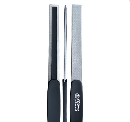 Верхнее напыление – сапфировое. С одной стороны абразивное покрытие крупнозернистое, с другой – более мелкое. Это позволяет сначала укоротить пластину, создать нужную форму, а затем устранить дефекты обработки. Эргономичная ручка снимает напряжение, не выскальзывает. Согласно отзывам в период службы она крепко фиксирована с металлической частью, не вылетает.