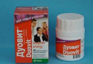 Дуовит Энергия. В составе практически все витамины из группы В, витамин Е, ретинол, йод, аскорбиновая кислота, хром, селен, экстракт женьшеня. Дуовит Энергия подходит для стимуляции тонуса, улучшения работоспособности. Поливитаминный комплекс особенно полезен тем, кто испытывает ежедневные интенсивные умственные и физические нагрузки. За счет витамина А и Е, а также селена Дуовит Энергия эффективно предотвращает раннее наступление возрастных изменений;