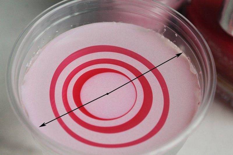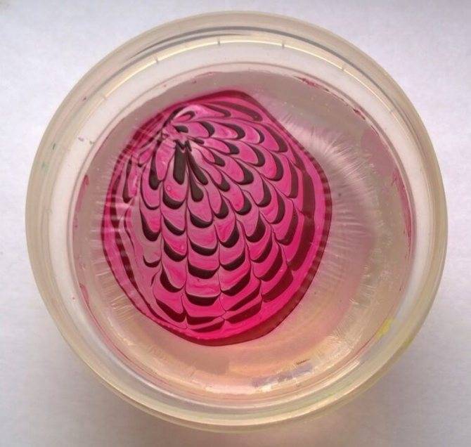 В первую очередь в стакан с водой добавляем лак. Это следует делать аккуратно капельным путем, нанося каплю одного цвета в центр емкости. После того, как лак разошелся по воде, создав тонкую пленку, наносим в середину круглого пятна следующий цвет и так до тех пор, пока ни наберется задуманное количество оттенков. В результате должно получиться что-то вроде мишени.