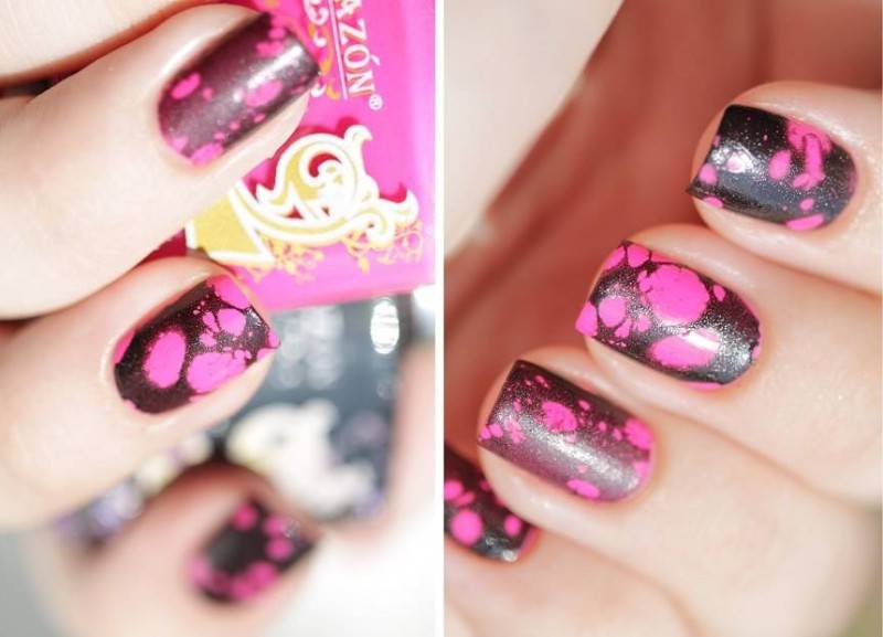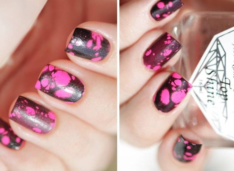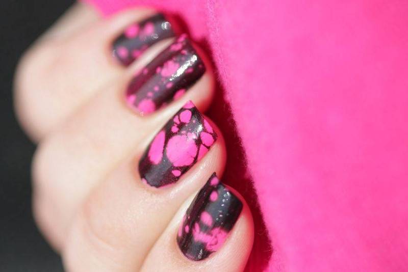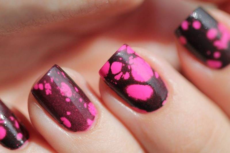 В воду капаем несколько капель черного лака для создания максимально плотного слоя и насыщенного цвета. После его распределения по поверхности воды нужно взять пульверизатор, залить в него немного лакоочистителя и с расстояния 30-40 см брызнуть на черную пленку. В результате на пленке появятся несколько отверстий с рваными краями. Вот их и нужно перенести на ногти, окрашенные в розовый цвет. Делается это, как и раньше, путем погружения одного или двух ногтей в воду параллельно ее поверхности.