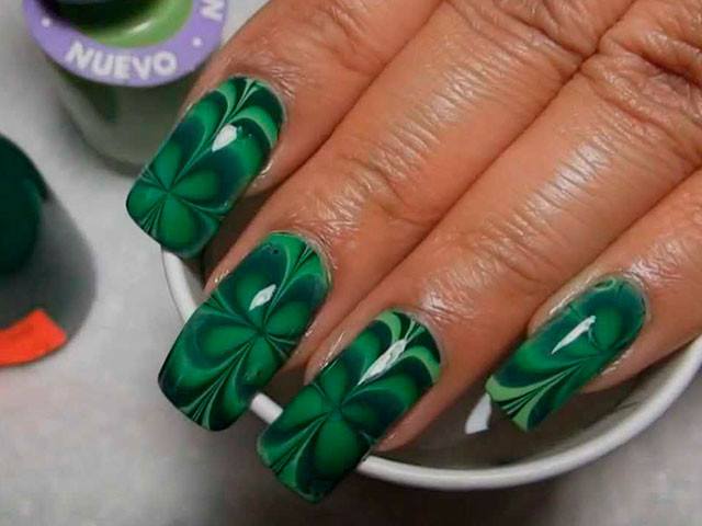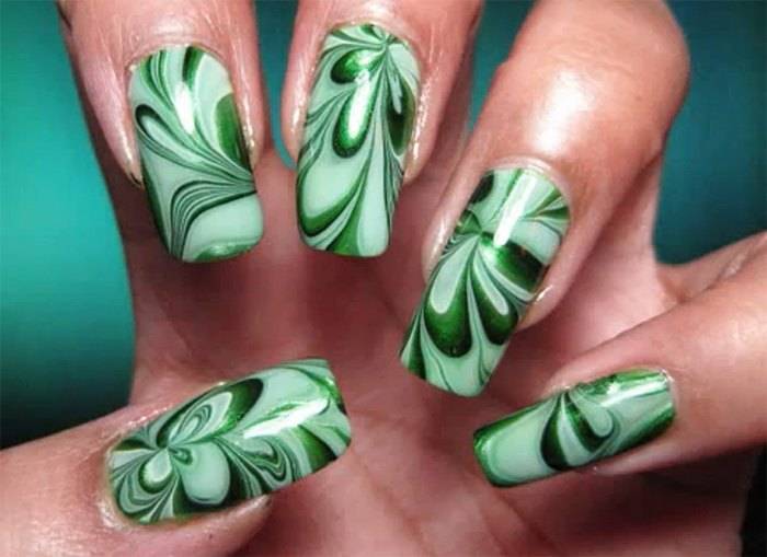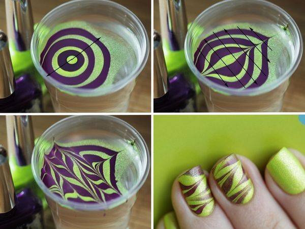 Данный дизайн получают с помощью воды и нескольких цветов лака.