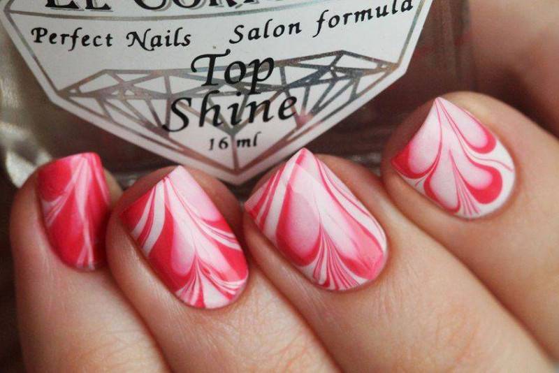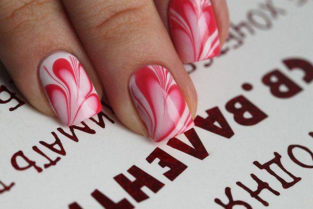Обратите внимание, что на фото ниже водный маникюр сделан всего из двух контрастных цветов лака для ногтей: ярко-красного и белого. Если Вы только начинаете экспериментировать с многоцветным маникюром и озадачены подбором цветов, то попробуйте подобную комбинацию из двух лаков, один из которых белый. Он сочетается почти со всеми цветами