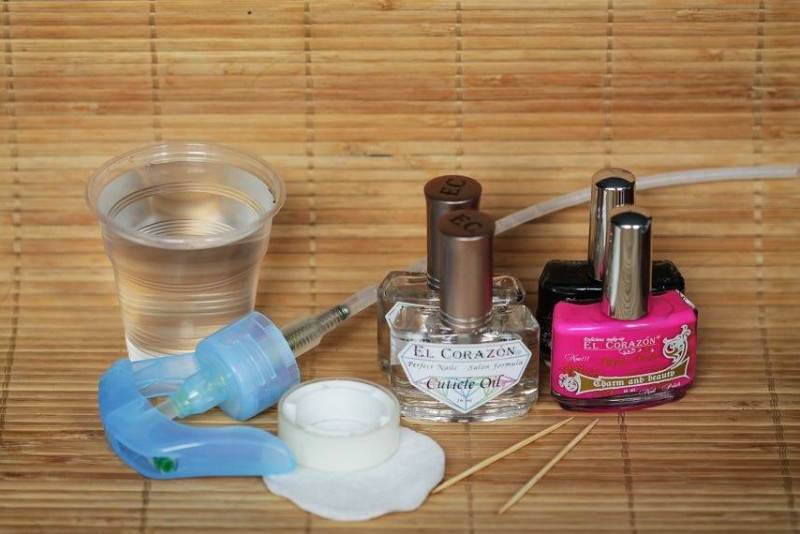 На первом этапе наносим на ногти базу в виде яркого лака. Пусть он будет, например, ярко-розовый. После высыхания ногтей нужно подготовить второй слой. Для этого нужна теплая вода в стакане черный лак и пульверизатор. Ногти готовим, как и раньше с помощью скотча или крема.