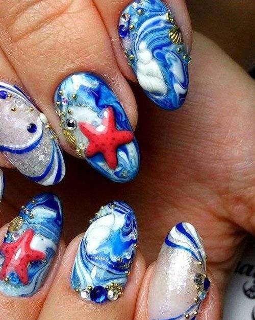 Водный дизайн очень красиво смотрится даже на ногтях средней и короткой длины, вот как на этом фото: